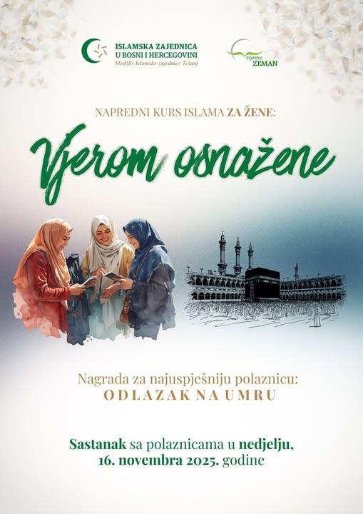 Medžlis Islamske zajednice Tešanj - Odjel za brak i porodicu i Udruženje Bošnjaka „Vrijeme-Zeman“ organizuju drugi po redu napredni kurs islama za žene pod nazivom: „Vjerom osnažene“.