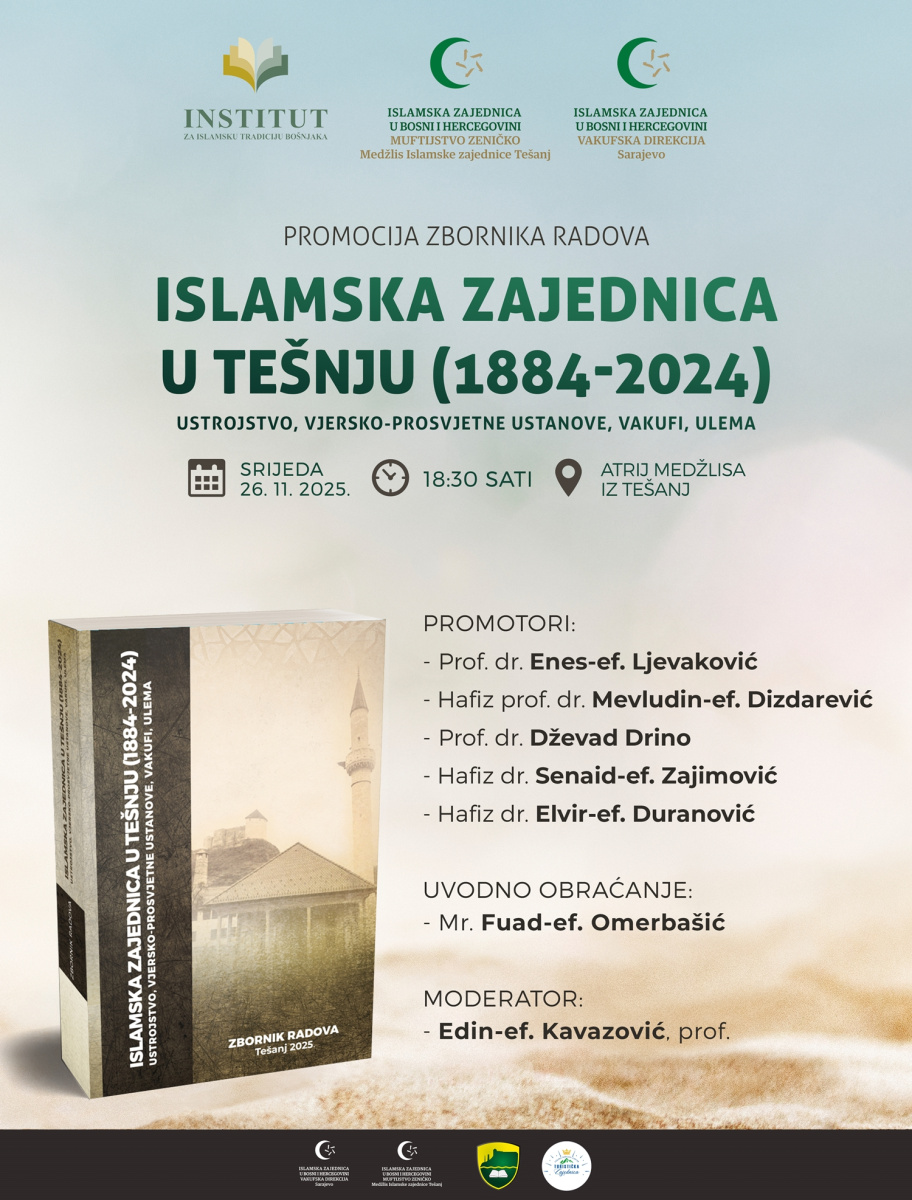 Medžlis IZ-e Tešanj, Institut za islamsku tradiciju Bošnjaka i Vakufska direkcija Sarajevo organizujuju i pozivaju vas na promociju Zbornika radova "Islamska zajednica u Tešnju (1884-2024) ustrojstvo, vjersko-prosvjetne ustanove, vakufi, ulema" u srijedu, 26.11.2025. godine u 18:30 sati u atriju Medžlisa IZ-e Tešanj.