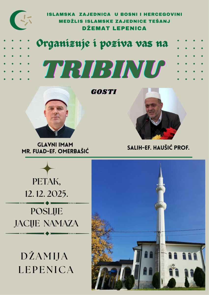 Džemat Lepenica organizuje i poziva vas na tribinu u petak, 12.12.2025.godine poslije jacije namaza u džemiji Lepenica.